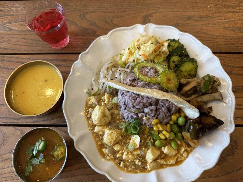 住宅街の中にある普通の一軒家のカレー屋さん 月に2.3日しか開いてないので訪問難易度は高めです。 席埋まってること多くインスタから予約していかないとほぼ食べれない。 藤沢では珍しい南インド系で2店舗くらいしか知らない。毎月違ったメニューのようで何回行っても飽きないかも 今回食べたのは豆腐とかも入っており、純インドというわけではなく面白い。一皿にいろんなもの載っており色々味が楽しめていいです
