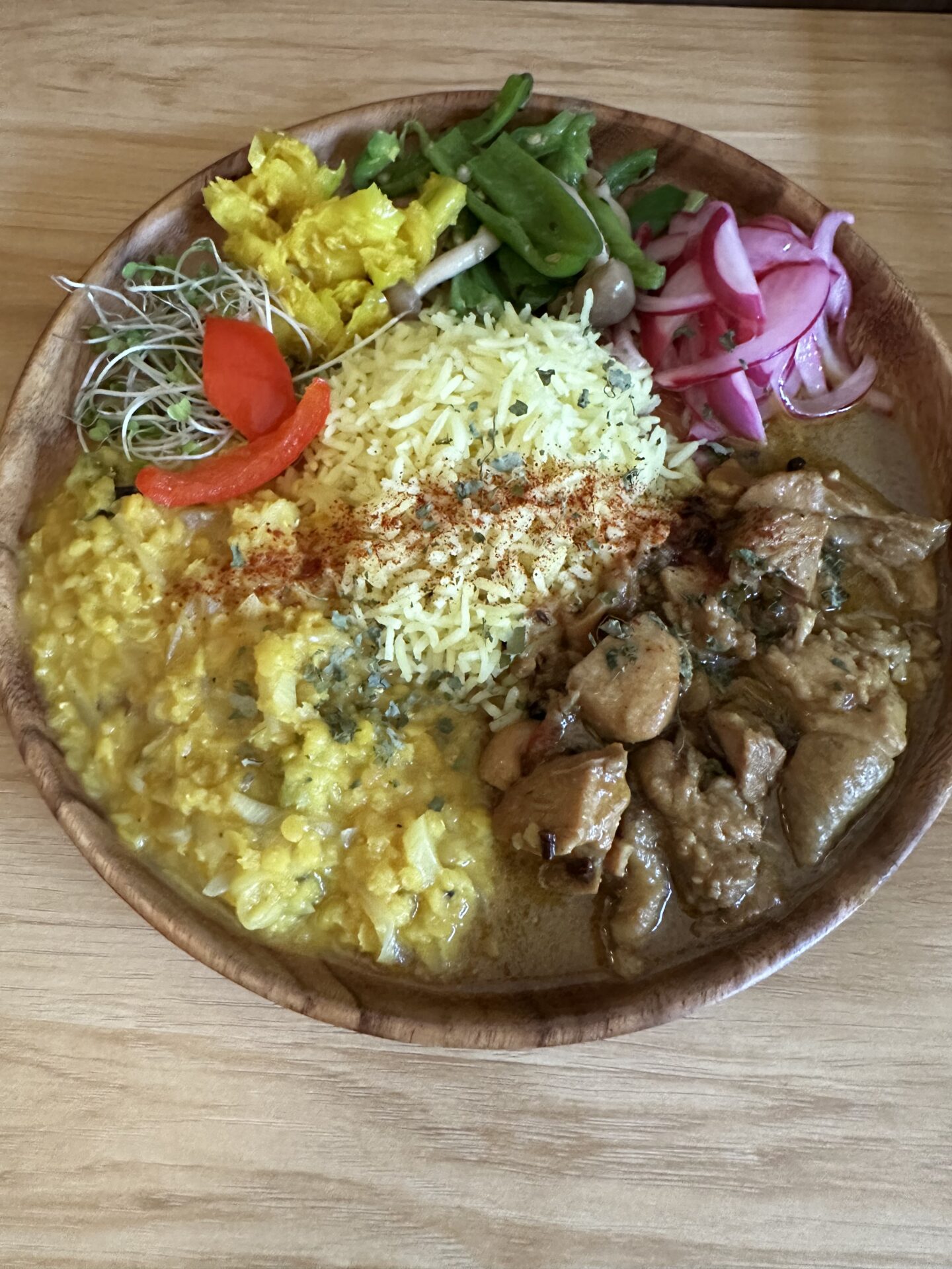 北仙台駅からすぐ近く少し坂登ったとこにあり、普通の一軒家なので入り口分かりにくいですが、玄関前に小さな看板出てます。 席はテーブル3つほど。 カレーは2種類から1種.2種盛り選べる。日によっては3種もあるみたい この日はゴーヤとレンズ豆のカレーとバターチキンカレー。2種盛りで頼んでみた。 2種ともすごく美味しい。辛さはほとんどないが、スパイスの味わいがよく出ています 見映えもかなり綺麗なので女子ウケしそう