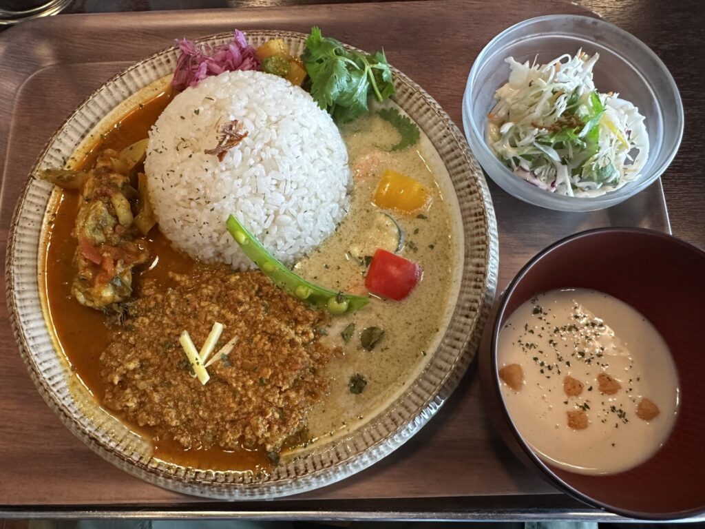 スパイスカレーですが、インド、ジャパニーズ、タイをベースにしたカレー。3種あいがけカレーにしてみた。辛さはほとんどない。どれも優しいお味。一緒についていた冷製スープも美味しい。仙台のカレー屋さん尖ってる感じのとこは無く、ここのカレーは嫌いな人はいないと思う