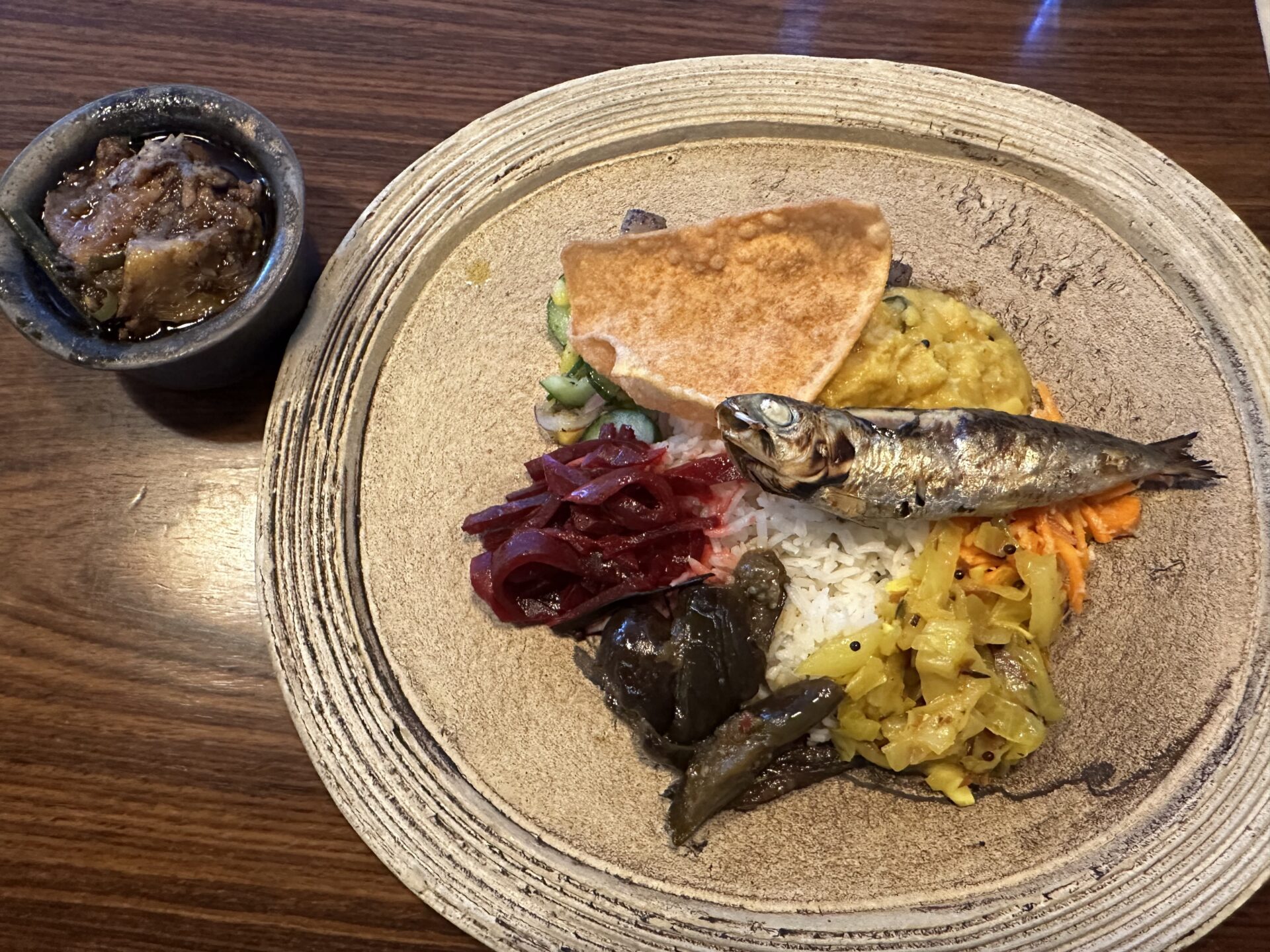 スリランカ料理店。 店内コンクリート打ち抜きでおしゃれ ランチのスリランカ定食は3種類のカレーが選べそれぞれスパイスが結構違いそう。 ルーの量は少なめです、物足りない時は追加カレーも頼める。スリランカらしくシャバシャバ系でした。肉のサイズは大きかった。おかずが結構あるので、カレーというよりおかずがメインなカレーです。
