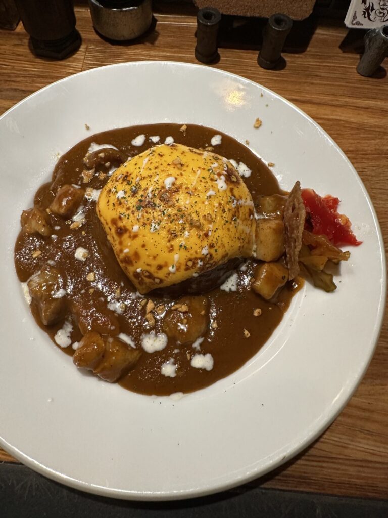 店内照明暗めで落ち着いてる。海鮮系の浜カレーがおすすめぽい。ウニがのったスペシャルもあった。 チーズが乗ったポークカレーを注文。上から見るとチーズハンバーグみたいに見える ルーは和風な魚介系。出汁がしっかり出てて美味しかった