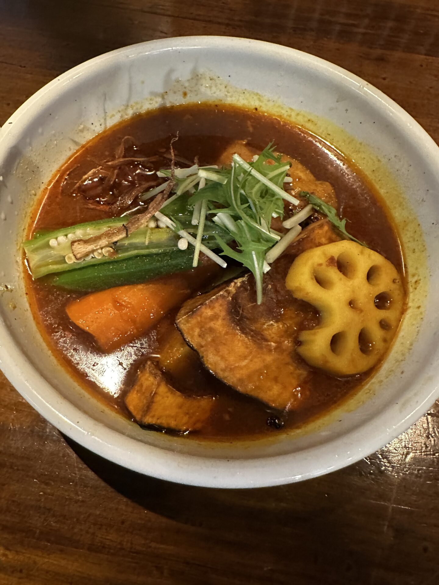 スープカレーの店ですが、通常のカレーも、置いてあります。キーマやコルマありました。 オススメと書かれていたチキンと野菜を注文。辛さは無料のMAX50。+料金でもっと辛くできるようです。 50でも辛さはそんなになく、旨味感じられる。低いレベルにして食べてる途中に辛さアップもお願いできる。スープは酸味が少し感じられる辛くした方が正解なスープな気がする。野菜が美味しかったです。